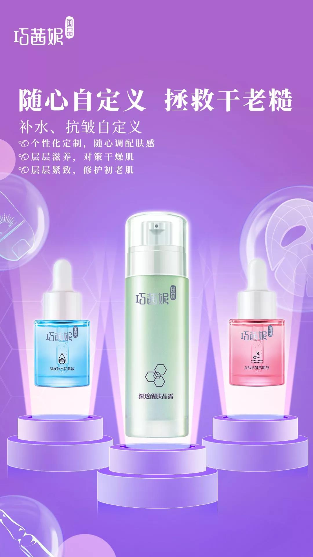 巧茜妮國(guó)品運(yùn)用多肽的優(yōu)勢(shì),打造出多肽抗皺活肌液,搭配深透醒膚晶露使用,層層緊致肌膚,修復(fù)初老肌。