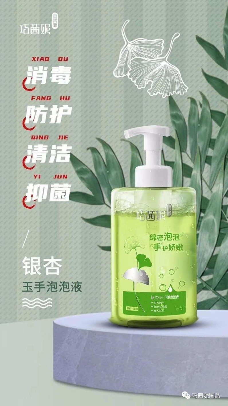 巧茜妮國品銀杏泡泡洗手液,有效消毒、防護、清潔、抑菌。