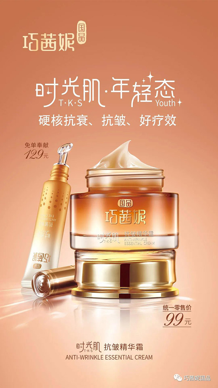 巧茜妮國品時光肌·抗皺系列,蘊含多種抗皺精華成份,賦予肌膚年輕狀態,配合多重潤膚保濕精萃,有效改善肌膚各類皺紋,為肌膚有皺紋的女性,帶來驚喜體驗,留住美好時光。