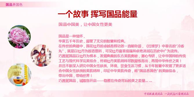“國品”歷經漫長注冊審核時期,于去年終于注冊成功,成為了中國化妝品行唯一一個具有國品認證的化妝品品牌,這是榮耀亦是責任,它是我們滿懷民族自信的精神支柱,也是我們肩上厚實的重擔。而2017年,巧茜妮國品將從以下幾個方面來進一步夯實“國品”行業地位,強化“國品”行業認知。