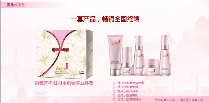 此套產品被命名為牡丹水肌水肌臻養五件套,2017年被寄予厚望,目標值是能在全國范圍內達到200萬套銷售量。外在,古色古香的外包裝設計,靈感充沛的旗袍元素糅合;內在,國花牡丹萃取精華,原生護膚能量充溢整套產品,必將帶給廣大“國粉”非同一般的“國品”護膚新體驗!