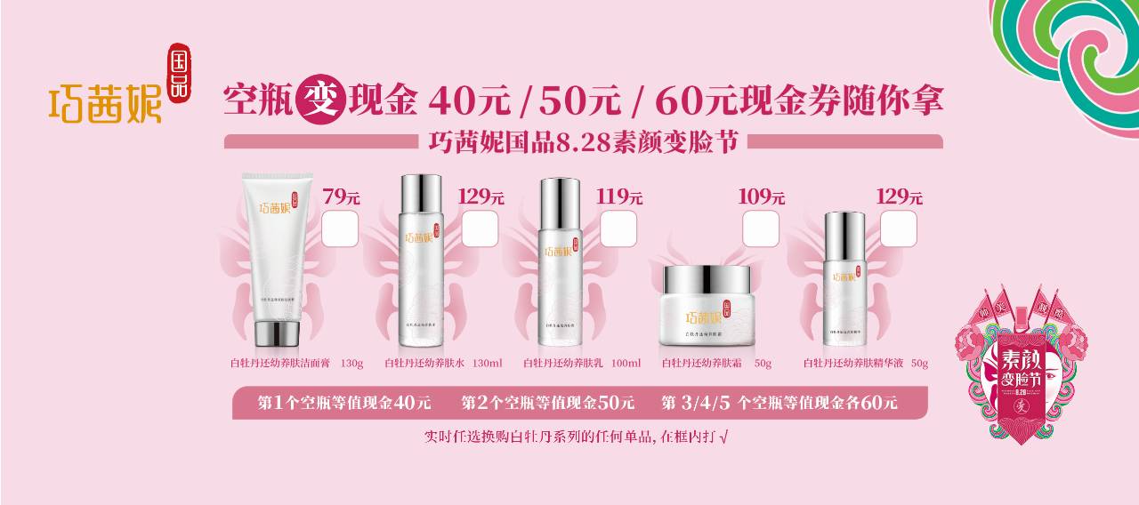 環節二:828環保先行,空瓶換購讓生活更精致。只要你家有空瓶,都可以拿過來換等值現金40/50/60元,購買白牡丹還幼養膚系列任意產品直減。