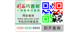 1. 撥打電話 020-89676666或登錄巧茜妮官方網(wǎng)站 2. 刮開防偽標(biāo)簽涂層,輸入防偽標(biāo)簽上的查詢碼,即可查詢真?zhèn)巍?/p> |