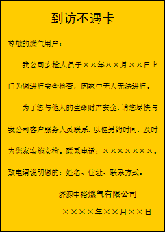 10月14日,濟源市網(wǎng)民“王屋山冬凌草”在當(dāng)?shù)匾痪W(wǎng)絡(luò)論壇上發(fā)帖“‘為到訪不遇卡’叫好”,對公司上門安檢的作法表示了由衷的贊賞。連日來,此帖引起了不少網(wǎng)友的共鳴。