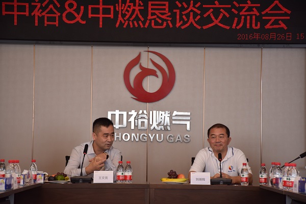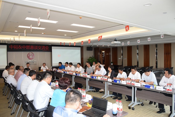 當(dāng)天,中國(guó)燃?xì)鈩⒚鬏x主席一行首先在王文亮主席及集團(tuán)管理層的陪同下,參觀了集團(tuán)本部新址。接著,雙方在多功能廳召開(kāi)“兄弟同心,其利斷金——中裕&中燃懇談交流會(huì)”,就目前經(jīng)濟(jì)形勢(shì)下行業(yè)發(fā)展面臨的挑戰(zhàn)與機(jī)遇進(jìn)行了探討,同時(shí)對(duì)集團(tuán)企業(yè)管理進(jìn)行了深度交流。